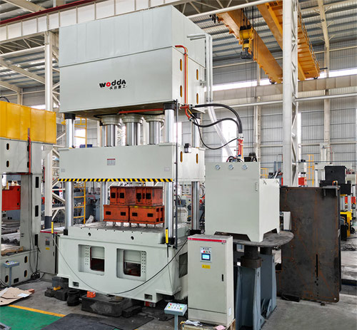1000噸液壓機是山東沃達重工機床有限公司為某汽車零部件生産廠家定做的液壓拉伸機,本機采用四柱多缸設計結構,另外為方便操作者更換模具可選配移動工作台裝置,為得到較好的拉伸效果,工作台下置液壓墊🔆裝置,脫模🔴效率高,多點頂出,有效的保護工件不受損。