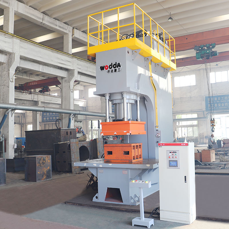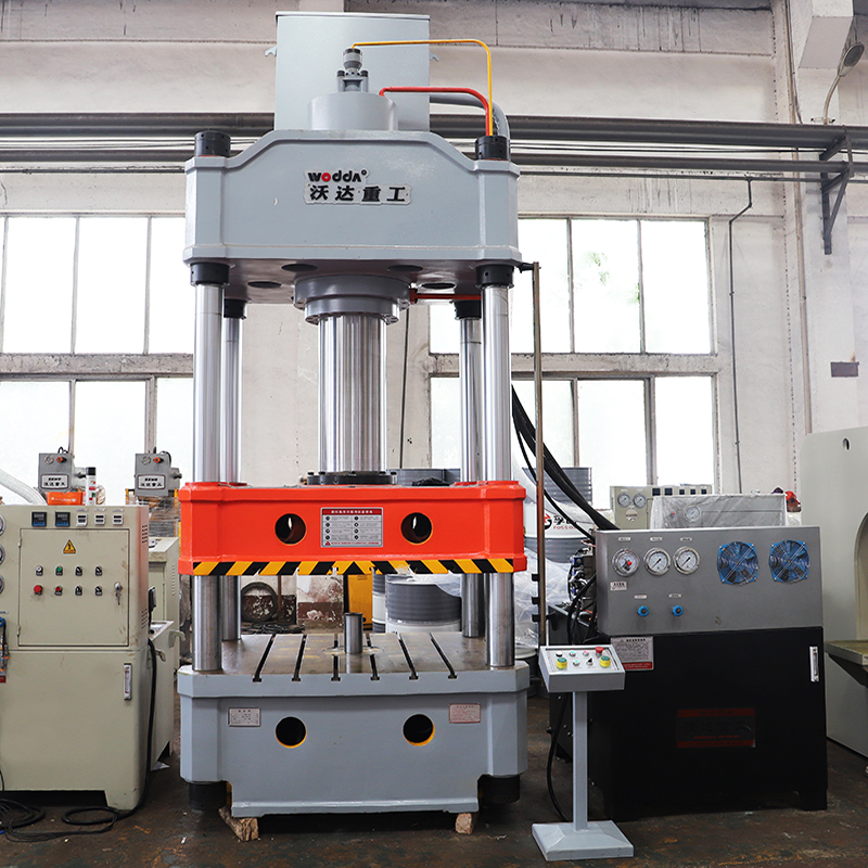 1、該款700噸四柱液壓機的油缸采用一主四副設計,主缸315噸,四🈲個副邊缸各100噸,分布在滑梁四個角,從而保證了壓力👣的均🔴勻分布;