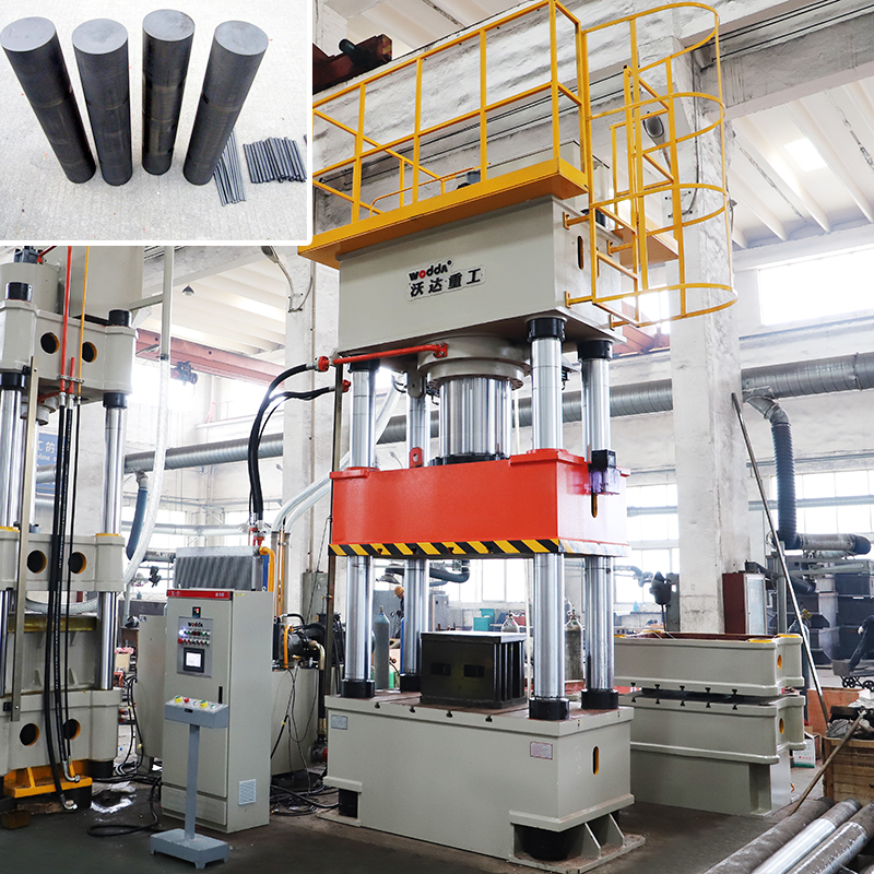 山東沃達重工研發、生産的這款630噸石墨碳棒成型液壓機可以生産高度在550mm以内,直徑在350mm之内的各種規格的石墨碳♋棒。這款石墨碳棒生産設備的特點有: